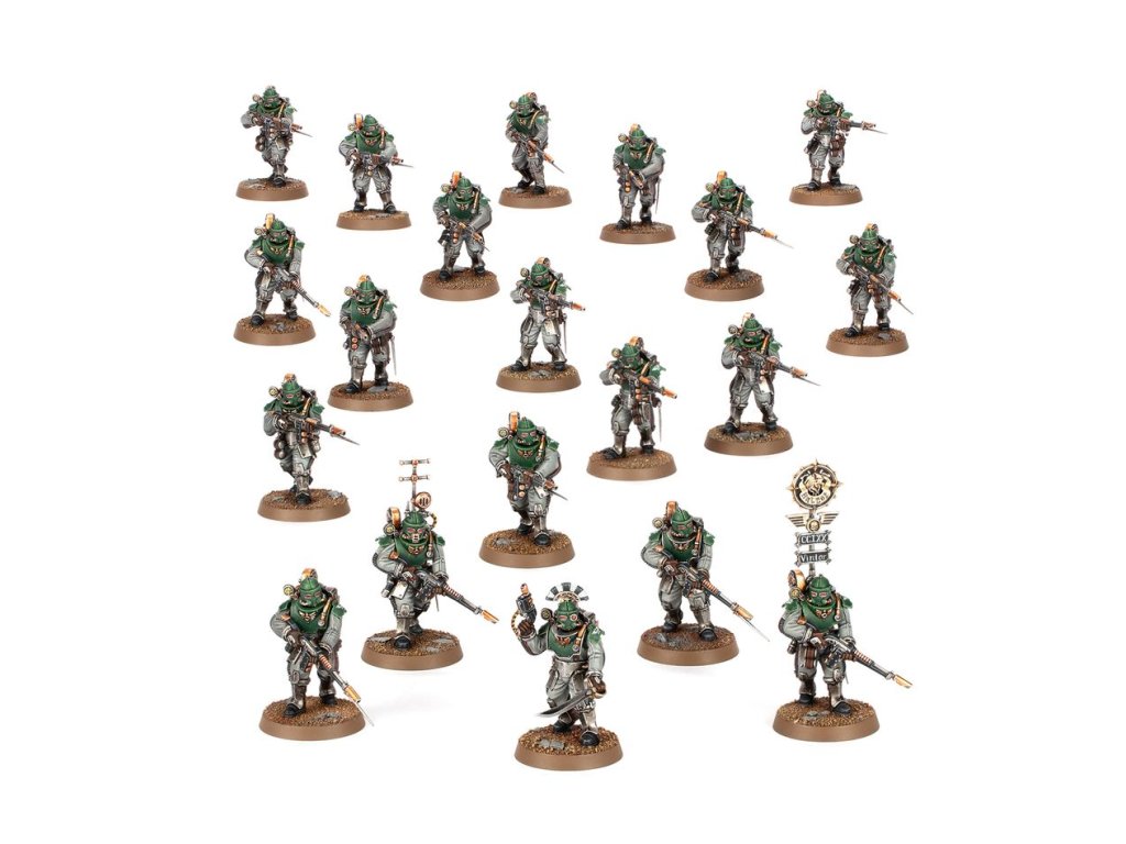 The miniatures in this kit are easy to customise. The Lasrifle Section miniatures can be fielded as one large unit, or two smaller ones of 10 Auxiliaries, each with their own optional Auxilia Sergeant, Auxiliary with vox interlock, and Auxiliary with auxilia vexilla. The Sergeants can be armed with your choice of laspistol, blast pistol, needle pistol, volkite serpenta, plasma pistol, or hand flamer, and a power fist, power sword, or charnabal sabre. Each Auxiliary's lasrifle can be upgraded with an optional bayonet.