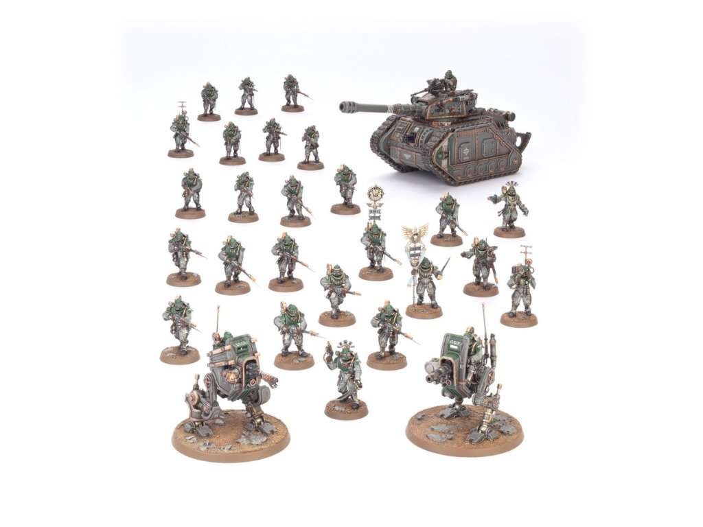 Pokud chcete udržet linii na ochranu Císaře nebo se připojit k pochodu za jeho svržením, tato sada je perfektním způsobem, jak založit novou kolekci Solar Auxilia – nebo rozšířit stávající armádu – a ušetřit peníze ve srovnání s nákupem sad jednotlivě. Najdete zde sekci Lasrifle, která je vynikající v držení cílů a kontrole bojiště s pomocí počtu vojáků. Taktická velitelská sekce je vede do bitvy, zatímco rychlí Hermes Sentinelové nepřítele obcházejí z boku. Mocný úderný tank Leman Russ poskytuje těžkou palebnou sílu a nutí vaše nepřátele držet hlavy sklopené neustálou palbou.