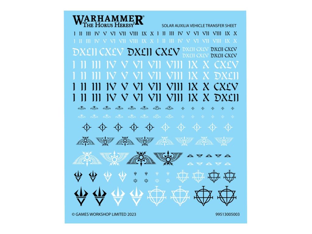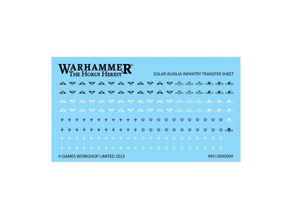 Tato sada obsahuje 790 plastových komponentů, 2x kulaté podstavce Citadel 60 mm, 25x kulaté podstavce Citadel 25 mm, 2x transferové listy pro pěchotu Solar Uxilia, z nichž každý obsahuje 152 vysoce kvalitních transferových listů pro tobogány, a 2x transferové listy pro vozidla Solar Uxilia, z nichž každý obsahuje 180 vysoce kvalitních transferových listů pro úpravu vašich miniatur.