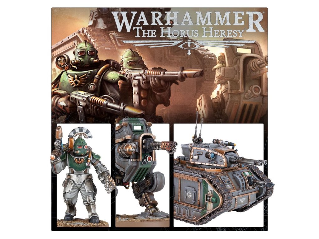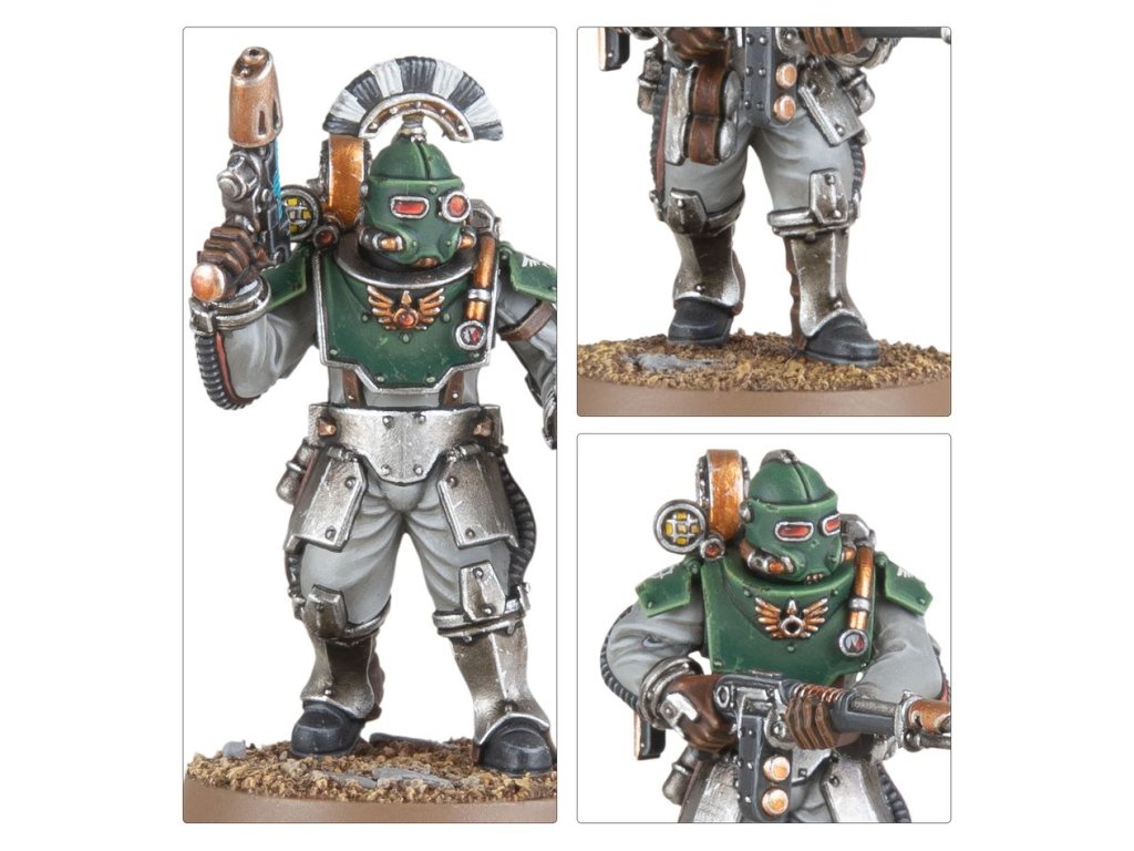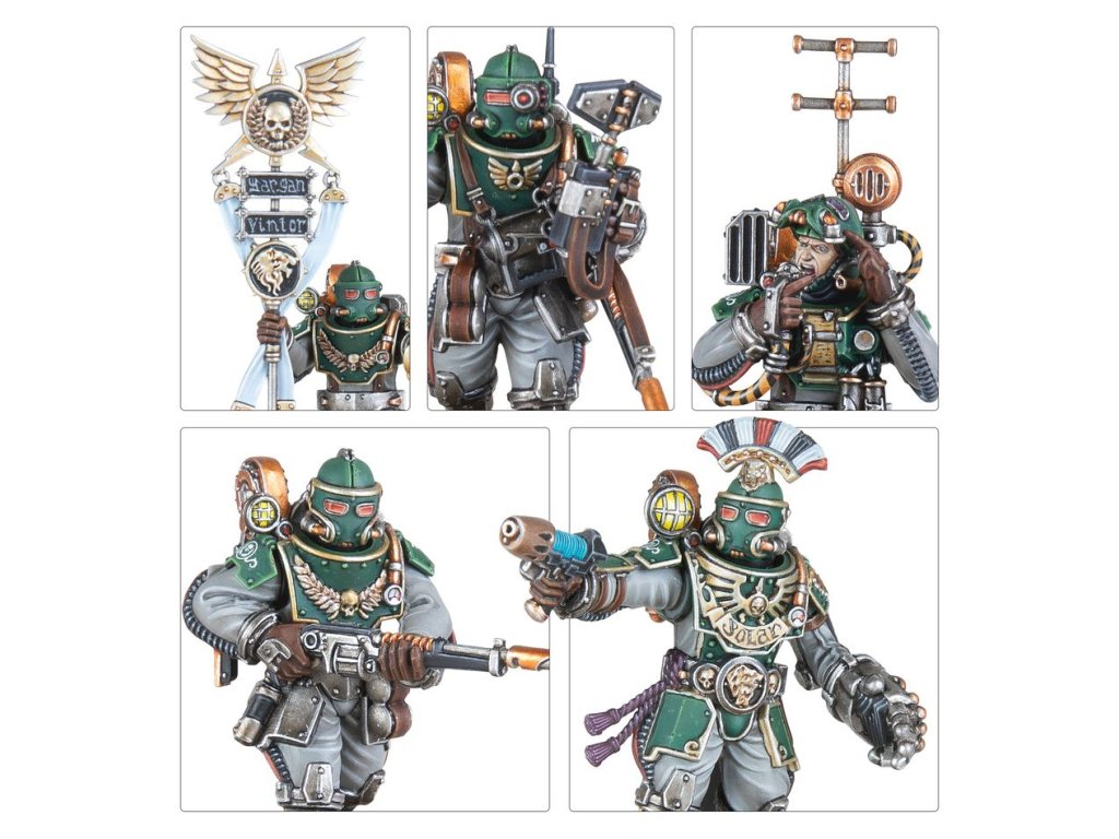 The Tactical Command Section builds an Auxilia Captain, armed with your choice of laspistol, blast pistol, needle pistol, volkite serpenta, plasma pistol, or hand flamer, and power fist, power sword, or charnabal sabre. The rest of the squad have options to take a command vox, augury scanner, and cohorts vexilla. They can also be used as a Line Command Section or Legatine Command Section, whose Legate Marshal can be armed with volkite serpenta, inferno pistol, archaeotech pistol, laspistol, blast pistol, needle pistol, plasma pistol, or hand flamer, and a thunder hammer, paragon blade, power fist, power sword, or charnabal sabre.