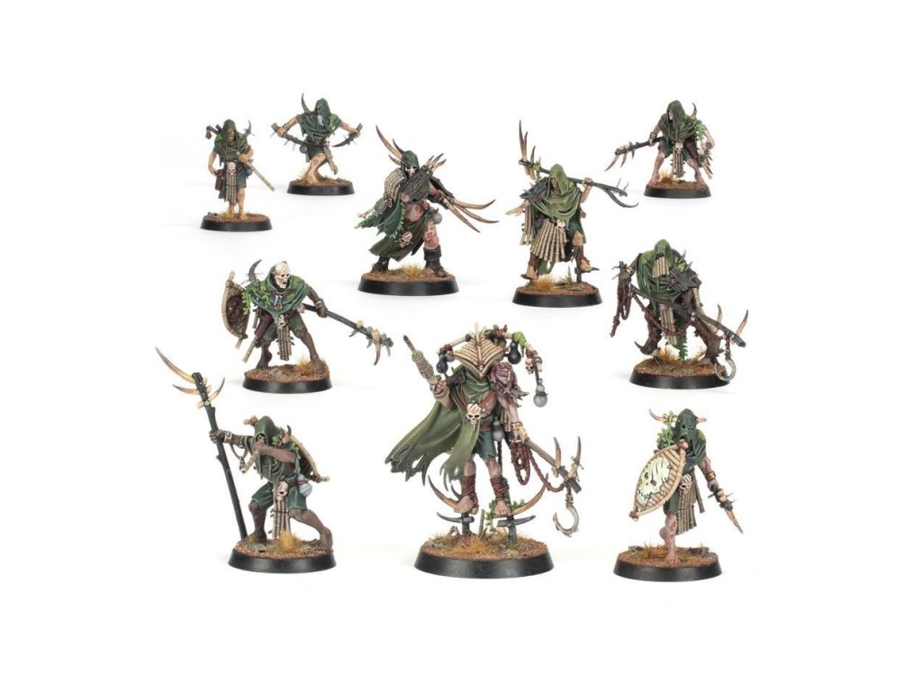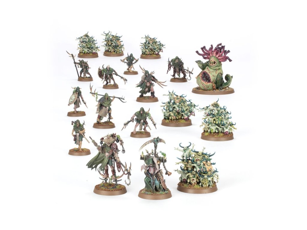 Grandfather Nurgle calls you to war, and this box is an ideal way to start a new Maggotkin of Nurgle collection – or expand an existing army – and save money compared to buying the kits individually. This army is led by a Rotbringer Sorcerer, wielding the putrefying magic of their patron. The bulk of the army comprises a cult of the Rotmire Creed, mortal followers who seek to expand the reach of Nurgle's contagions. A sizeable contingent of Nurglings is along for the ride. These capering daemonic hosts are hard to kill, making them ideal for holding vital objectives. An eager Beast of Nurgle backs everything up, ready to take on your largest foes. These miniatures comprise a complete Spearhead force, meaning you're ready to jump into tight, tactical games and drown the Mortal Realms in rivers of filth right out of the box.