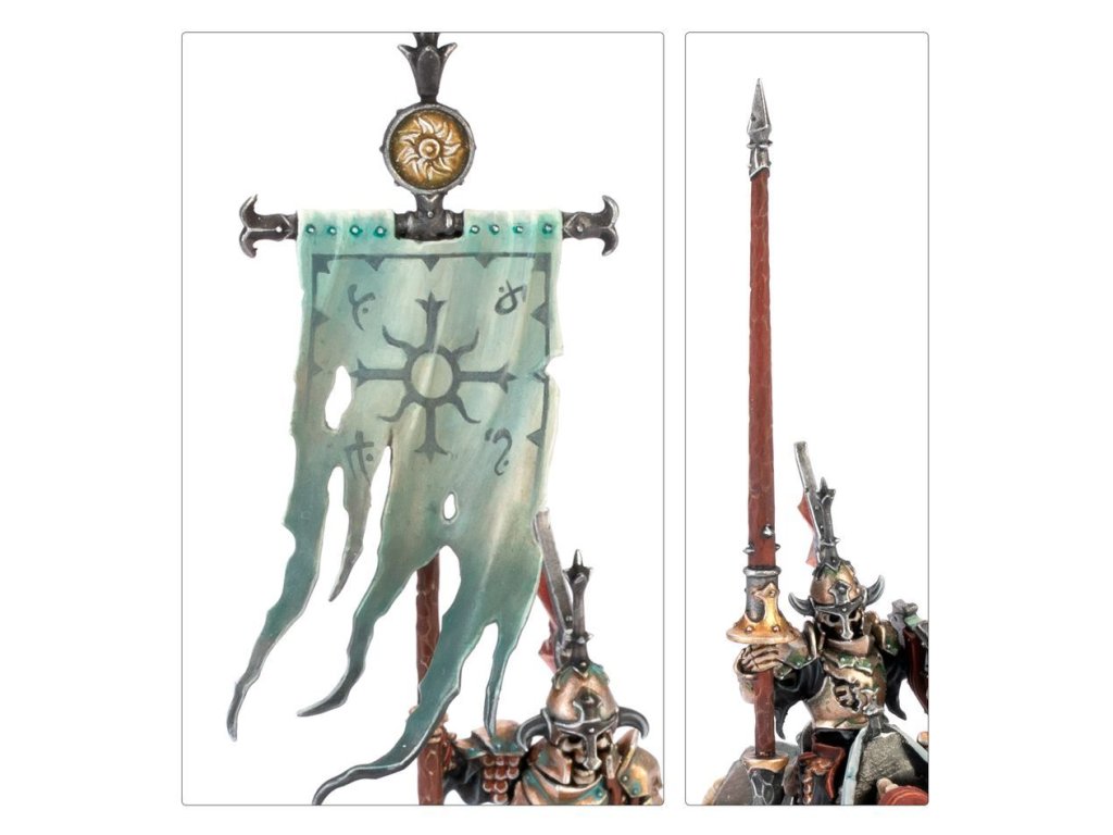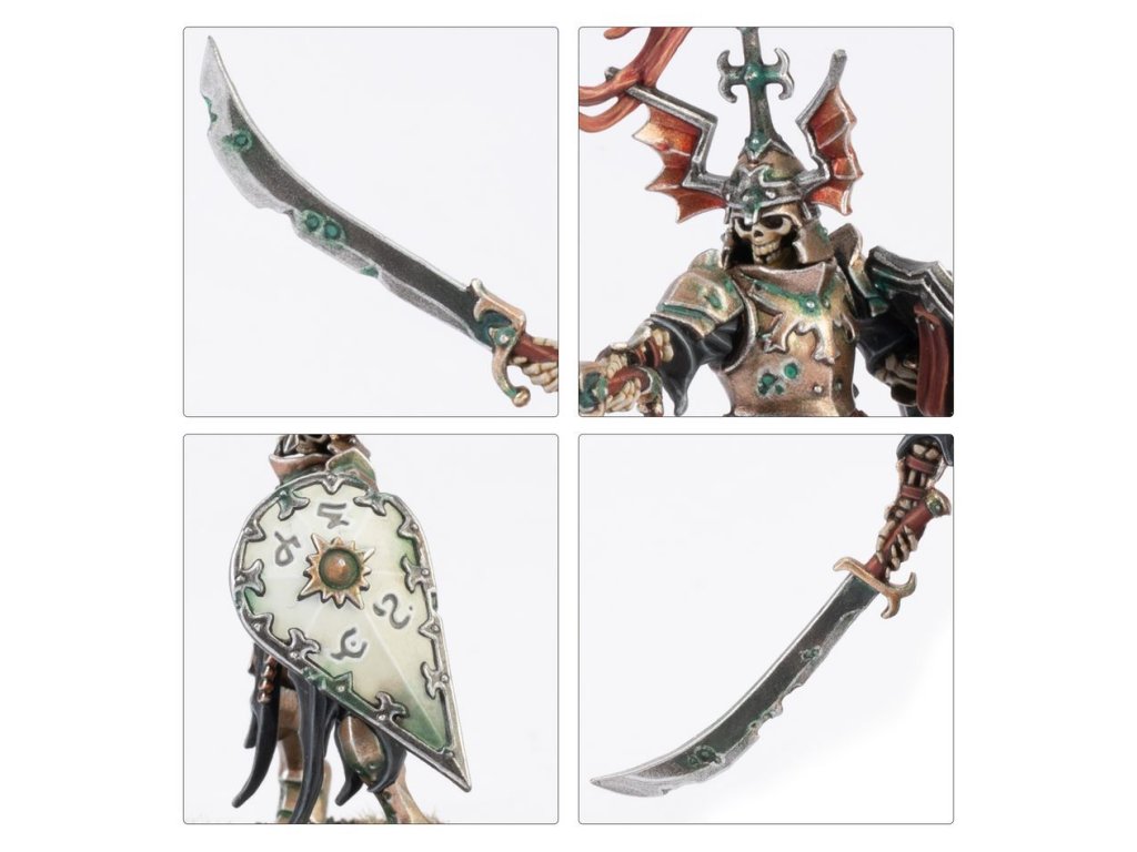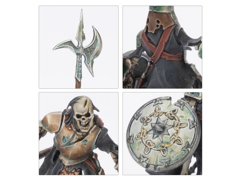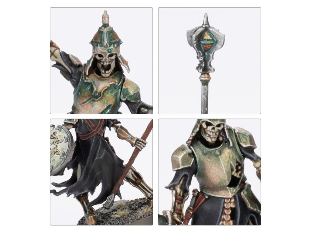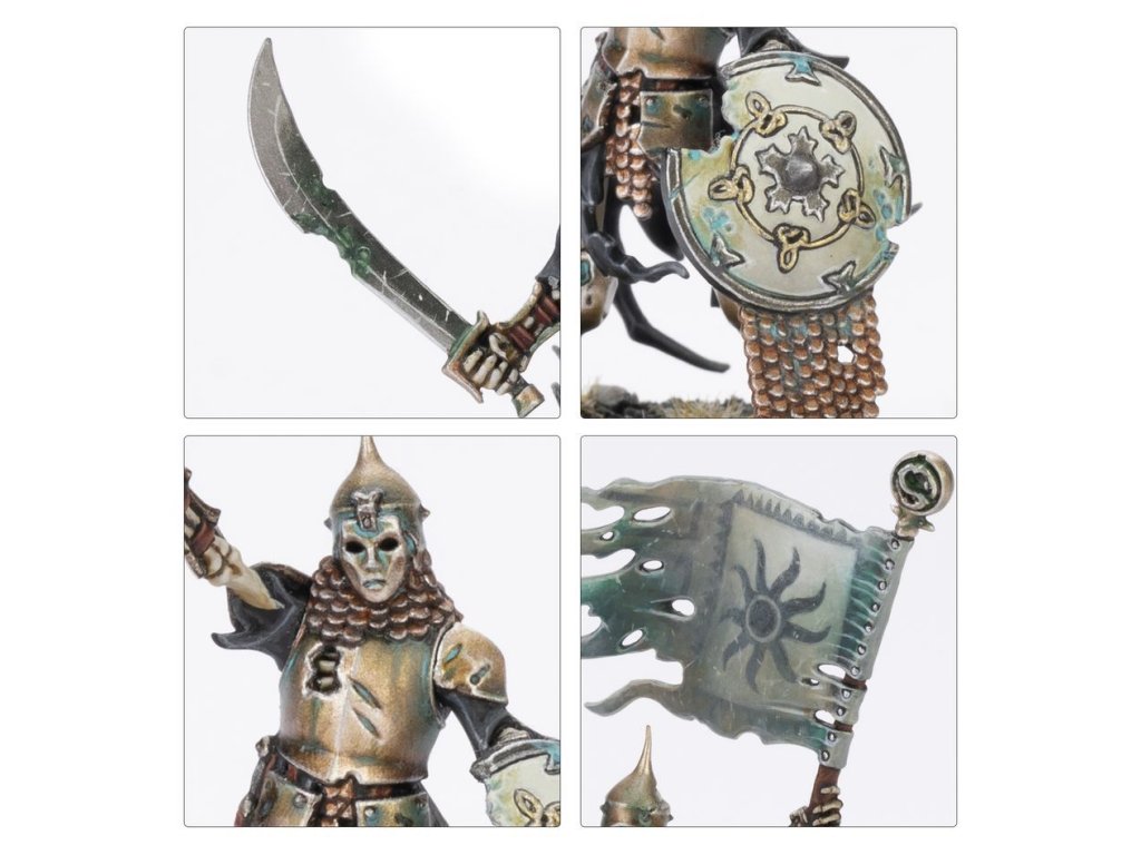The Barrow Guard can include an optional champion armed with either a sword and shield or a mace, a standard bearer, and a musician. The helmets are interchangeable across the unit, and they can swap their rusted swords and distinctive shields for heavy two-handed glaives.