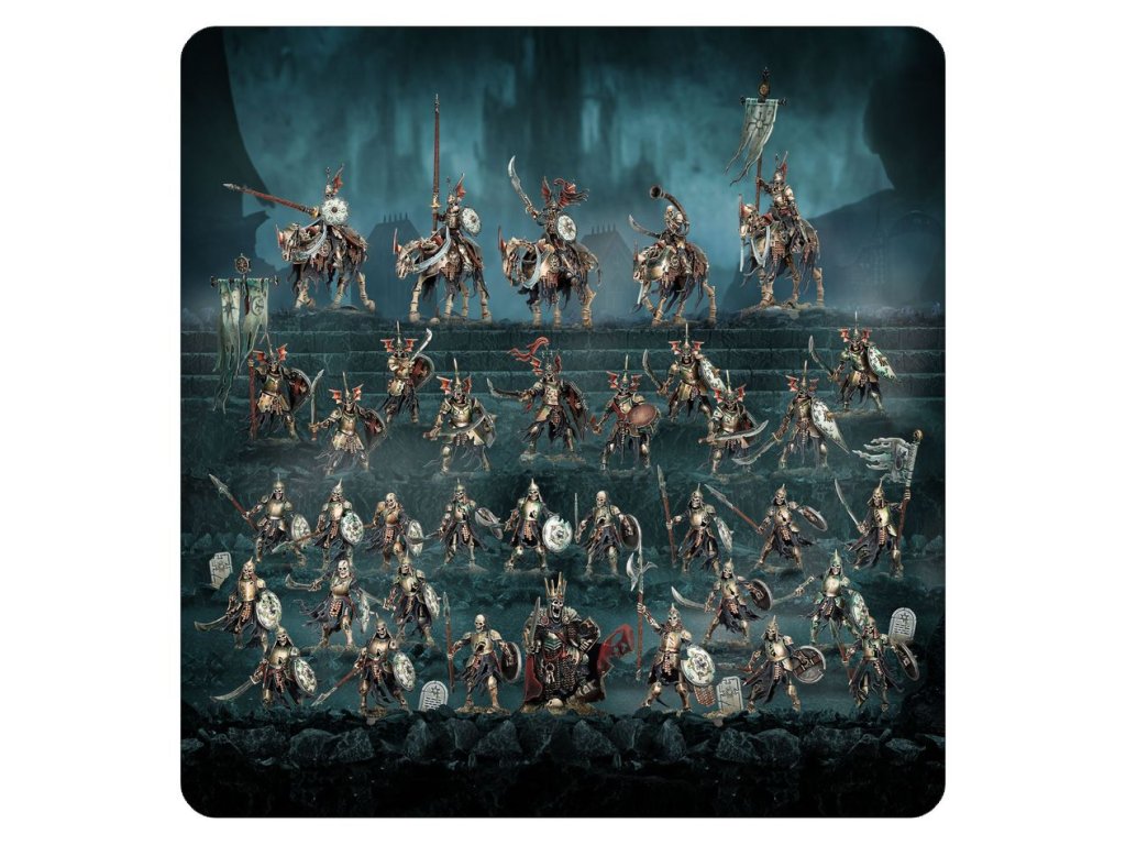 Vyslechněte si volání do zbraně s touto krabicí, ideálním způsobem, jak založit novou kolekci Soulblight Gravelords – nebo rozšířit stávající armádu – a ušetřit peníze ve srovnání s nákupem sad jednotlivě. Armádě vede velící král Umrtí, který bojuje v čele hord, a je chráněn elitní Mohylovou stráží. Jednotka Mohylových rytířů se řítí vpřed, aby rozbila silné jednotky a dobývala cíle, zatímco velká jednotka Deathrattle Skeletonů ovládá hrací plochu a chrání životně důležité prostředky. Tyto miniatury tvoří kompletní sílu Spearhead, což znamená, že jste připraveni vrhnout se do těsných, taktických her a drtit živé hned po vybalení z krabice.