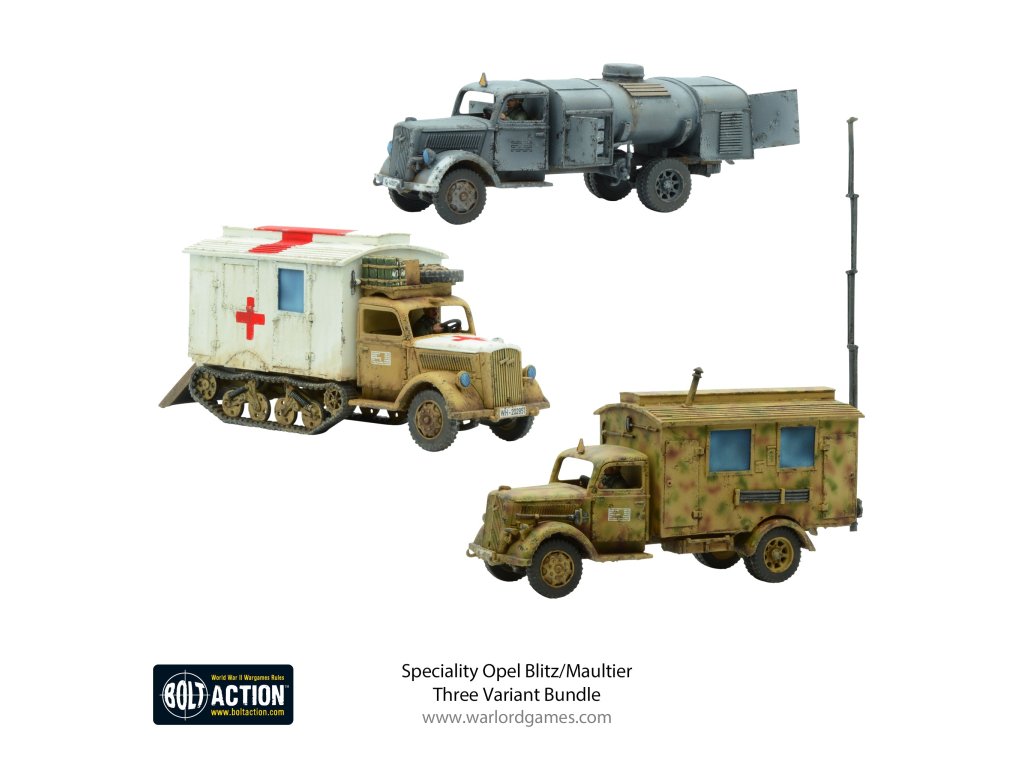 Kolový Opel Blitz a polopásová verze Maultier patřily k nejikoničtějším a nejvšestrannějším německým válečným vozidlům. Nákladní vůz plnil řadu rolí v několika variantách. Ať už vaše armáda zahajuje Blitzkrieg v Polsku, Francii a Sovětském svazu, trpí dusivým horkem a prachem Západní pouště, nebo čelí spojeneckému útoku na Evropu a tlaku do Německa, tyto Opely jsou skvělým doplňkem vaší armády s Bolt Action.
