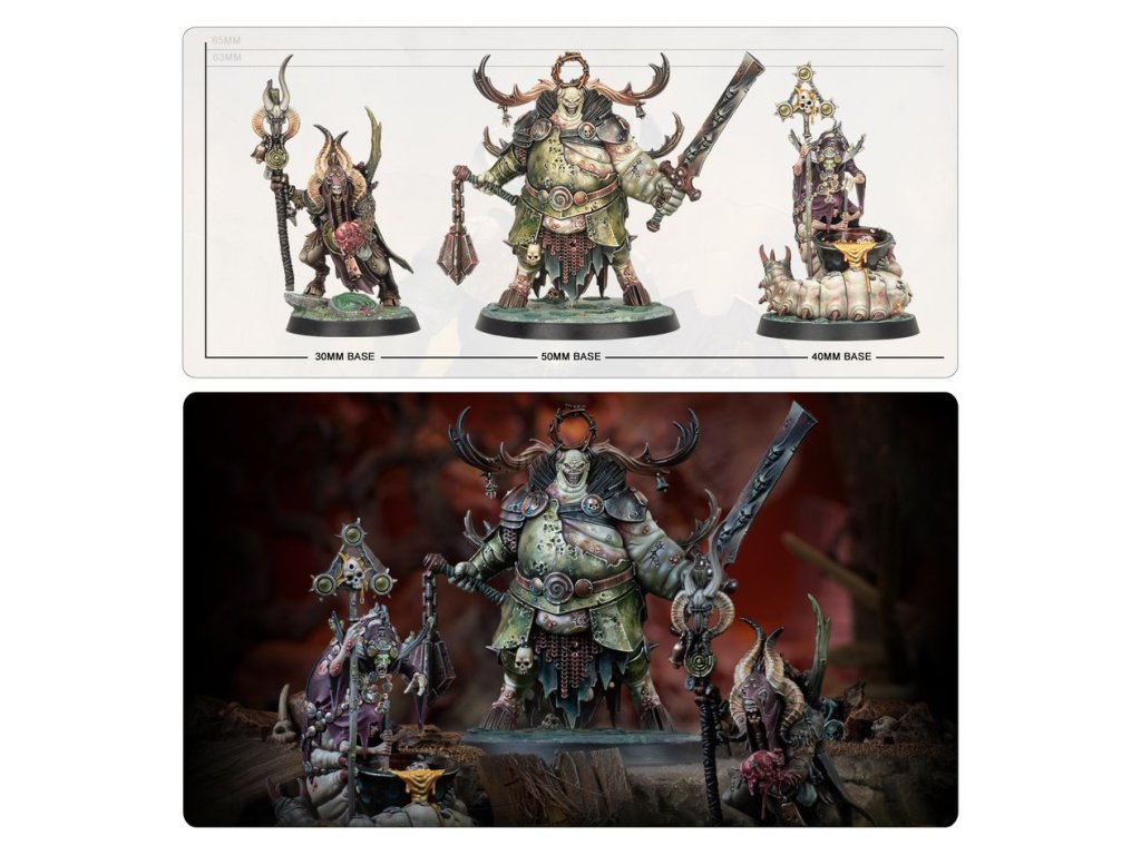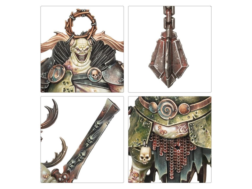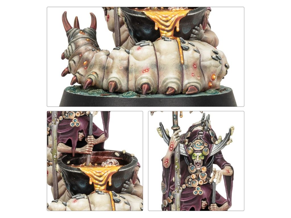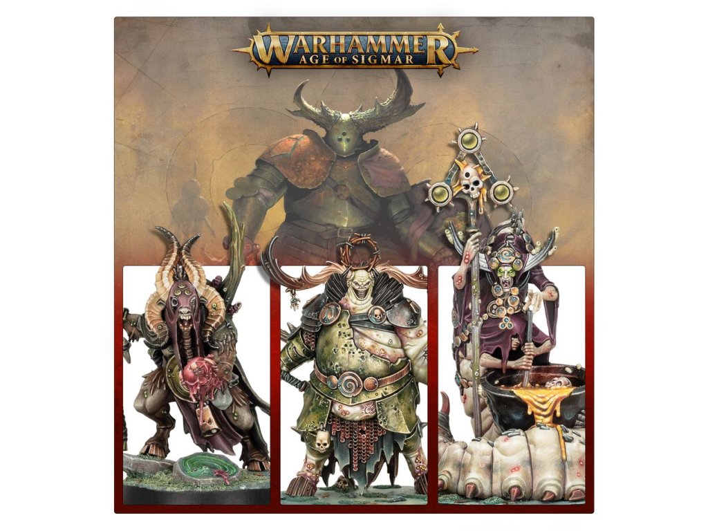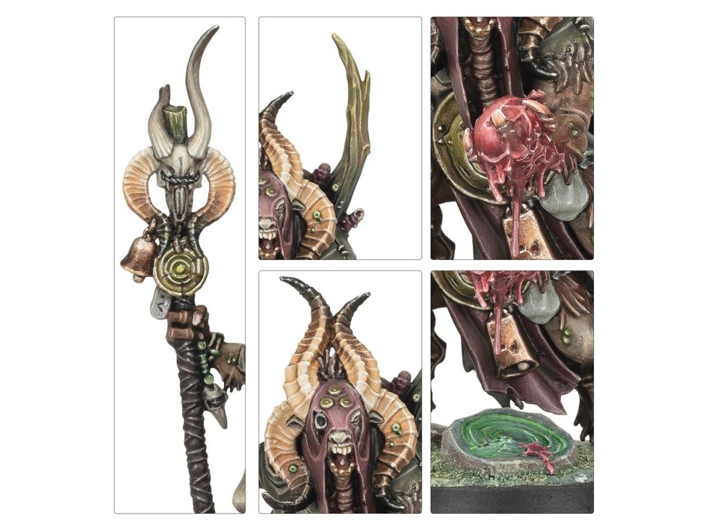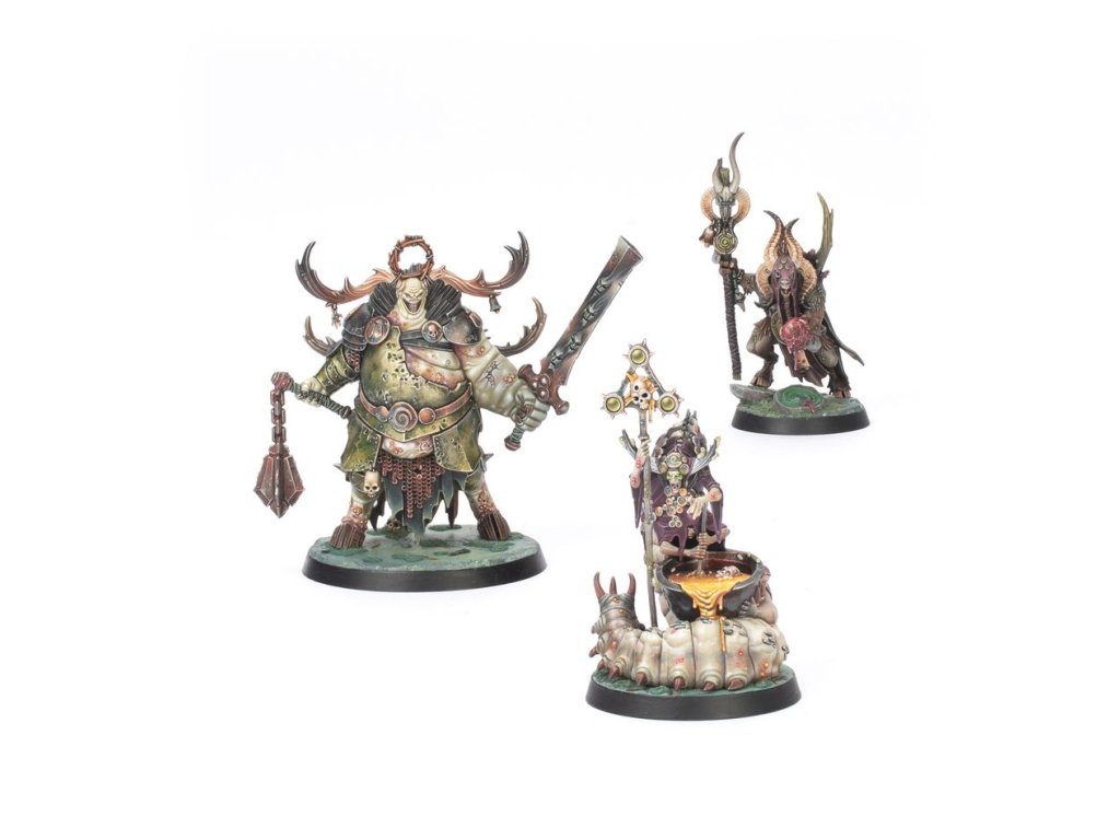 The Daemon Prince Gelgus Pust is a grotesque and monstrous creature whose corpulent body is riddled with parasites. Once a pious man, his ambition saw him fall into Nurgle’s clutches. He relishes despoiling the land, particularly the pure waters of Ghyran, where he makes his lair. He is often accompanied by Belga, a mortal who succumbed to the whispers of Nurgle and devolved into a maggot-bodied horror, her former sisters melded with her flesh. Foulhoof, a rancid shaman of vile renown regarded as a prophet by his bestial kind, completes the foul Daemon Prince’s court.
