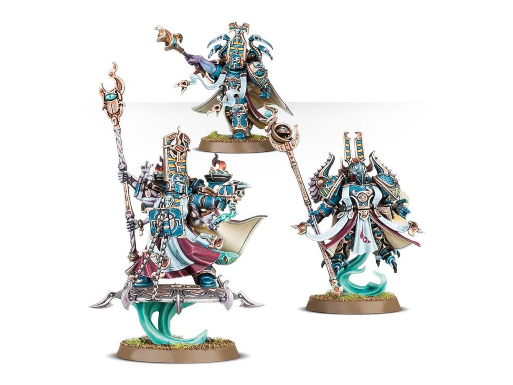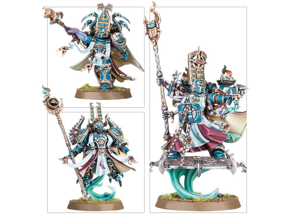 The miniatures in this box are easy to customise. The Exalted Sorcerers have seven heads, six staff toppers, nine shoulder pads, and three backpacks – all of which are interchangeable across the unit.