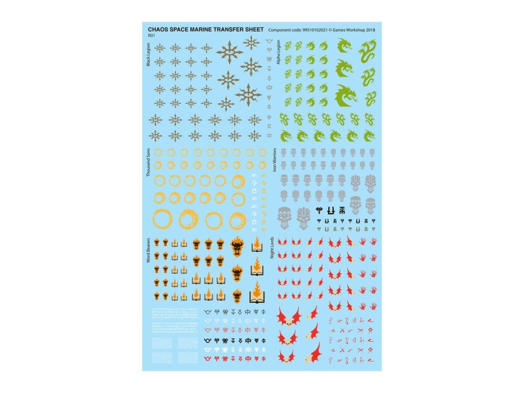 The kit also includes 2x Chaos Space Marine Transfer Sheets, each containing 364 high-quality waterslide transfers. These feature symbols for the Thousand Sons, Black Legion, Word Bearers, Iron Warriors, Alpha Legion, and Night Lords, along with generic icons relating to the different Chaos gods.
