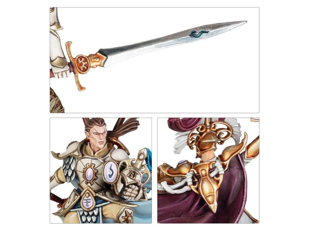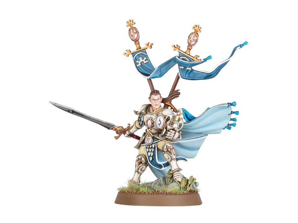 This multipart plastic kit builds a Vanari Lord Regent, an expert warrior and strategist for your Lumineth Realm-lords armies in Warhammer Age of Sigmar. This inspiring leader marches alongside the Vanari forces clad in aetherquartz-empowered armour, cutting foes down with their blades, and rallying the troops to their side. The miniature can be built in one of two different ways – with helmet in hand and back banners fluttering in the breeze, or equipped with a tall shield and wearing a majestic crested helmet.