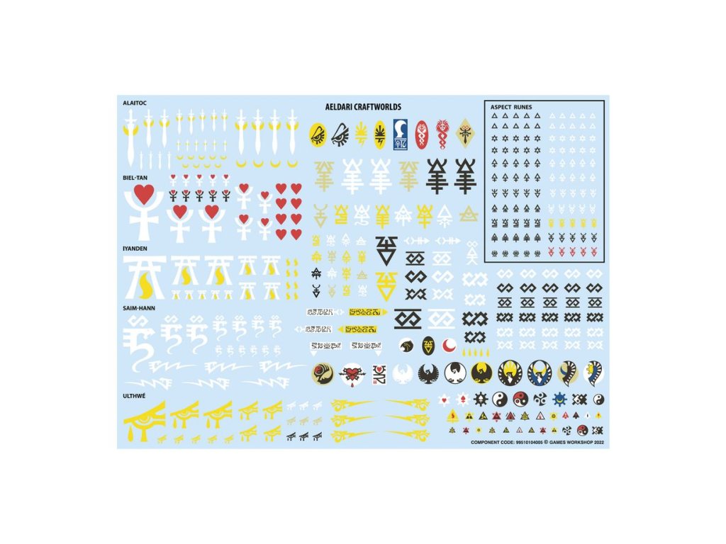 This kit is supplied with 1 Aeldari Craftworlds Transfer Sheet, containing 378 high-quality waterslide transfers. These include symbols for the Alaitoc, Biel-Tan, Iyanden, Saim-Hann, and Ulthwé Craftworlds, along with Aspect Runes and other markings to decorate your miniature.