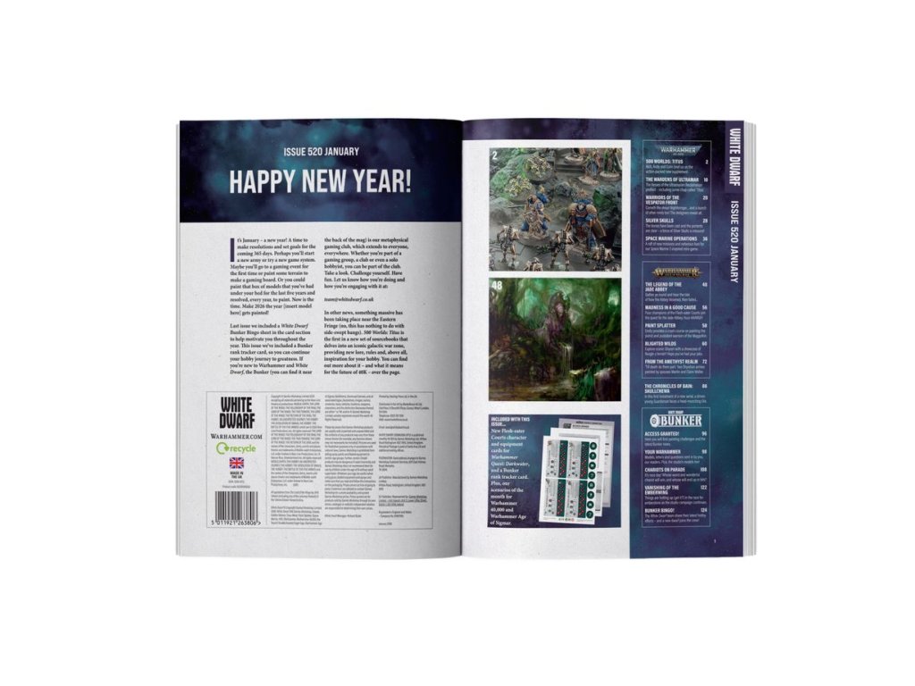 Each copy of White Dwarf 520 also comes with a double-sided card featuring the Warhammer 40,000 and Warhammer Age of Sigmar Scenarios of the Month. Also included are 4x Flesh-eater Courts Character cards, 8x double-sided Initiative tokens, and 4x Equipment/Upgraded Equipment cards for Warhammer Quest: Darkwater, plus 1x double-sided Bunker rank tracker. You'll also find a set of scan-and-print cards for the Space Marine Operations game, including 2x Threat Level Minoris cards, 3x Threat Level Majoris cards, 4x Threat Level Extremis cards, and 2x Threat Level Terminus cards.