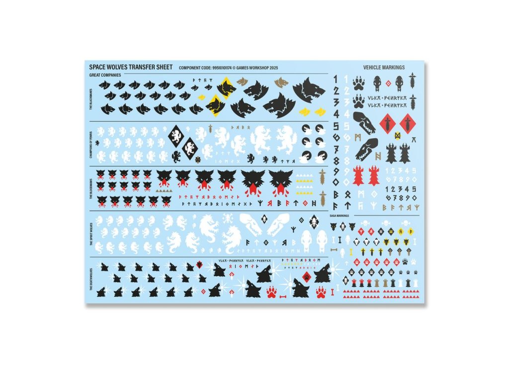 Tato sada obsahuje 65 plastových komponentů, 3 kulaté podstavce Citadel 40 mm, 3 oválné podstavce Citadel 60 mm x 35 mm a 1 arch pro transfer s motivem Space Wolves Army Set obsahující 419 vysoce kvalitních obtisků s motivem tobogánů pro ozdobení vašich miniatur.