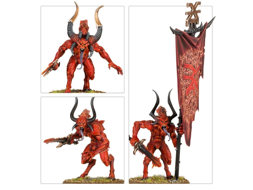 The Bloodletters include parts to build up to two optional champions, musicians, and standard bearers who can each be assembled with your choice of two different icons. The heads and arms are interchangeable across the daemonic bodies in the set.