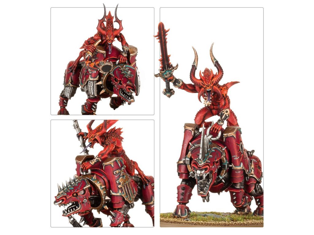 The miniatures in this box are easy to customise. The Lord on Juggernaut wields an exalted chainblade in the form of either a vicious chainsword or long-handled chainaxe, and is also armed with a plasma pistol – he can be posed aiming the plasma pistol at his enemies, or clinging to one of his mount's rings. Both the Lord and his steed have a choice of two different heads. He can alternatively be built as Lord Invocatus, one of Khorne's chosen warriors.